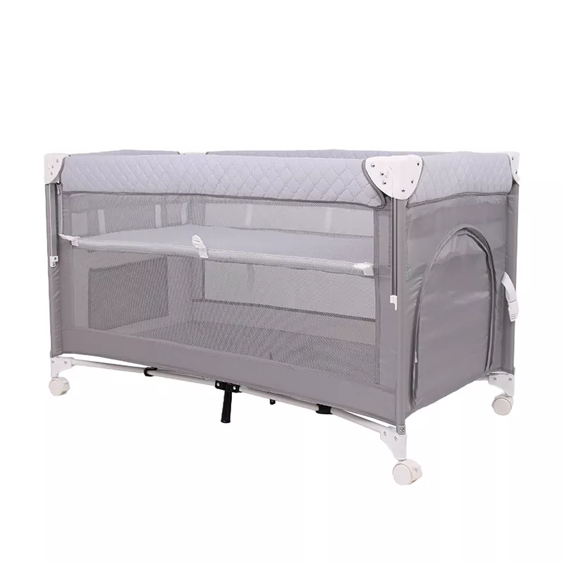Bebevovos P1201 sammenleggbare og løftende barneseng kan brukes som barneseng, barneseng og et stort lekeområde. Den er delt inn i et mellomlag og et bunnlag. Ved å glide opp kan mellomlaget forvandles til en komfortabel soveseng for babyen din. Sidelommene kan justeres i høyden, noe som gjør det mulig å oppbevare nødvendigheter til babyer like ved hånden. Bunnlaget kan brukes som et romslig lekeområde for eldre babyer, og kan også brukes som babyvugge ved å åpne støtterammen. P1201 Folding and Lifting Baby Crib er laget av høykvalitets Oxford-duk og aluminiumslegering eller jernrør, som er slitesterk.